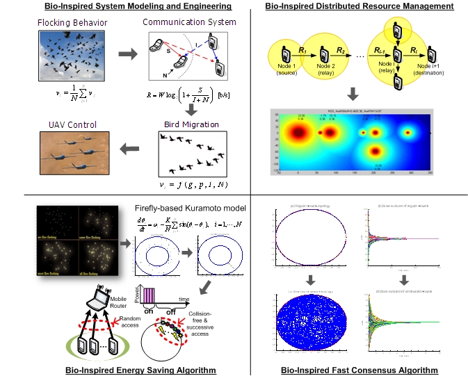- Apply bio-inspired algorithms (e.g., ACO, Flocking algorithm, Firefly synch/desync., etc)